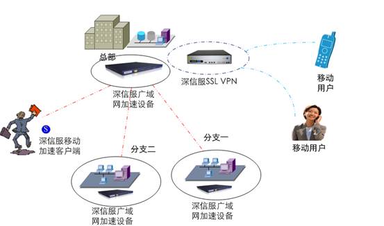 在組織總部部署深信服SSL VPN+廣域網優化産品,分布在外的分支機構通(tōng)過部署廣域網優化設備,實現與總部廣域網優化設備的網絡交互,此時(shí),深信服廣域網優化設備通(tōng)過削減傳輸通(tōng)道(dào)中的重複數(shù)據、優化傳輸協議、壓縮傳輸文件等多(duō)種手段,達到快速而經濟的網絡傳輸與數(shù)據傳輸。而且深信服廣域網優化設備集成VPN模塊,可(kě)對通(tōng)道(dào)內(nèi)的數(shù)據時(shí)行(xíng)加密來(lái)保障組織的業務數(shù)據安全。