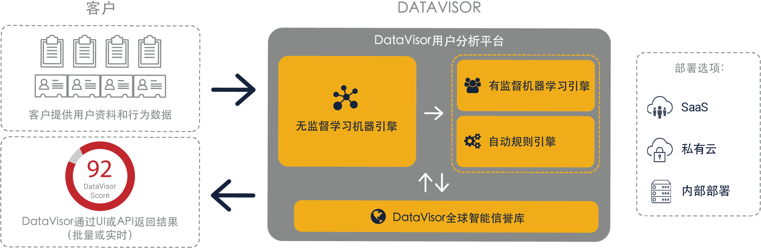 首先,DataVisor從客戶那(nà)裏獲取用戶資料和(hé)事件數(shù)據,之後由DataVisor高(gāo)級數(shù)據工程師(shī)對用戶數(shù)據進行(xíng)解析、完成數(shù)據特征提取工程,為(wèi)用戶分析平台做(zuò)好準備。DataVisor數(shù)據分析平台包含了四大(dà)組成模塊:無監督機器(qì)學習引擎、有(yǒu)監督機器(qì)學習引擎、自動規則引擎和(hé)DataVisor全球智能信譽庫。客戶可(kě)以通(tōng)過DataVisor用戶界面、DataVisor用戶分析控制(zhì)台獲取檢測結果,或者通(tōng)過DataVisor結果API批量導出或實時(shí)傳送檢測結果。根據客戶不同的業務需求,DataVisor數(shù)據分析平台提供多(duō)種類型部署選項,包括內(nèi)部部署、SaaS服務和(hé)私有(yǒu)雲部署。