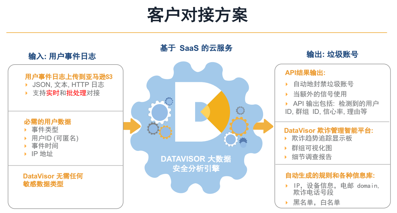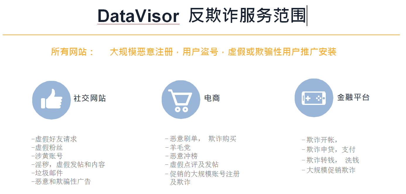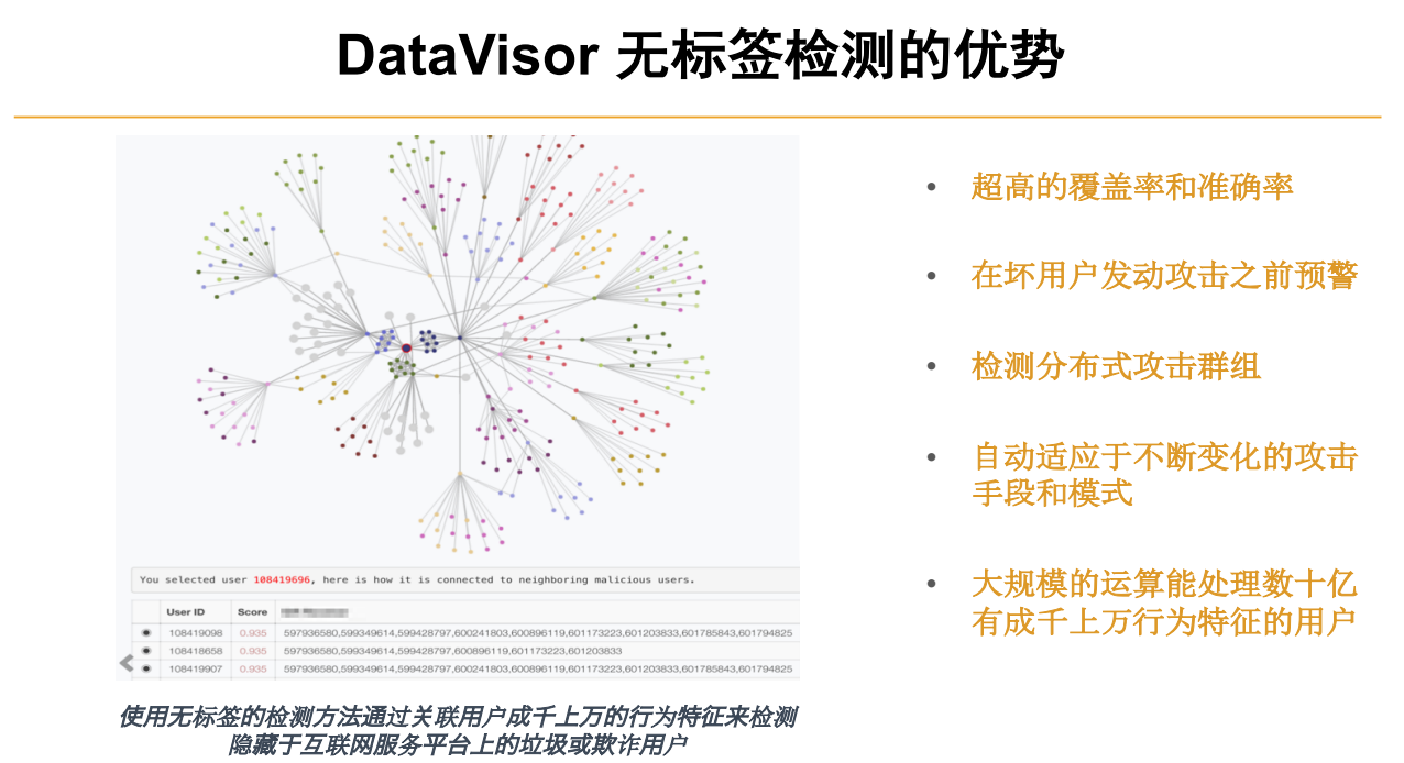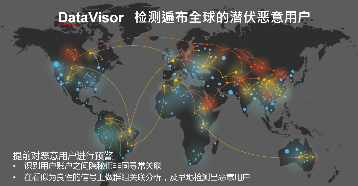 DataVisor用戶分析平台通(tōng)過同時(shí)使用多(duō)種技(jì)術(shù),為(wèi)客戶提供全面的反欺詐技(jì)術(shù)檢測服務,包括單一類型的欺詐檢測,及橫跨多(duō)種不用應用場(chǎng)景的多(duō)種類型欺詐檢測,如虛假賬戶、推廣濫用、洗錢(qián)等。DataVisor數(shù)據分析平台通(tōng)過分析數(shù)十億用戶屬性數(shù)據和(hé)交易數(shù)據,保證客戶清楚了解用戶所有(yǒu)的行(xíng)為(wèi)數(shù)據,如精準分辨好用戶和(hé)壞用戶,判斷哪些(xiē)是潛伏期賬戶,哪些(xiē)是正準備發起攻擊的用戶等。