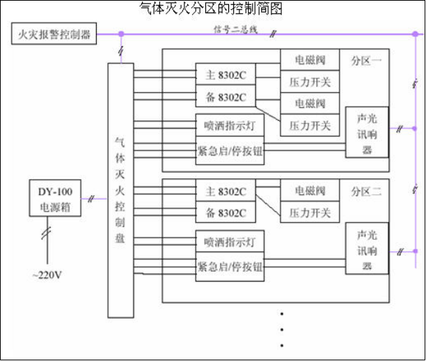 按各個(gè)機房(fáng)防護區(qū)的特征和(hé)滅火(huǒ)方式采用全淹沒滅火(huǒ)系統,無管網輸送方式采用組合分配系統。