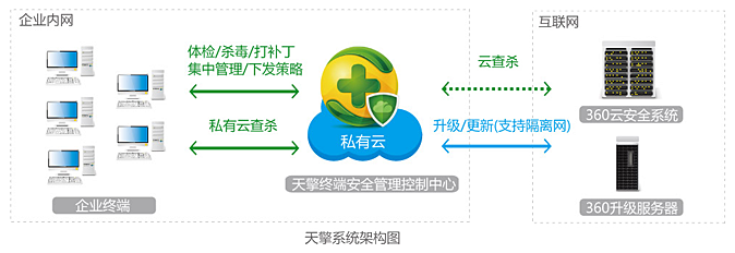 360天擎終端安全管系統是360面向政府、企業、金融、軍隊、醫(yī)療、教育、制(zhì)造業等大(dà)型企事業單位推出的集防病毒與終端安全管控于一體(tǐ)的解決方案。360天擎終端安全管理(lǐ)系統,以大(dà)數(shù)據技(jì)術(shù)為(wèi)支撐、以可(kě)靠服務為(wèi)保障,它能夠為(wèi)用戶精确檢測已知病毒木馬、未知惡意代碼,有(yǒu)效防禦APT攻擊,并提供終端資産管理(lǐ)、漏洞補丁管理(lǐ)、安全運維管控、網絡安全準入、移動存儲管理(lǐ)、終端安全審計(jì)、XP盾甲防護諸多(duō)功能。